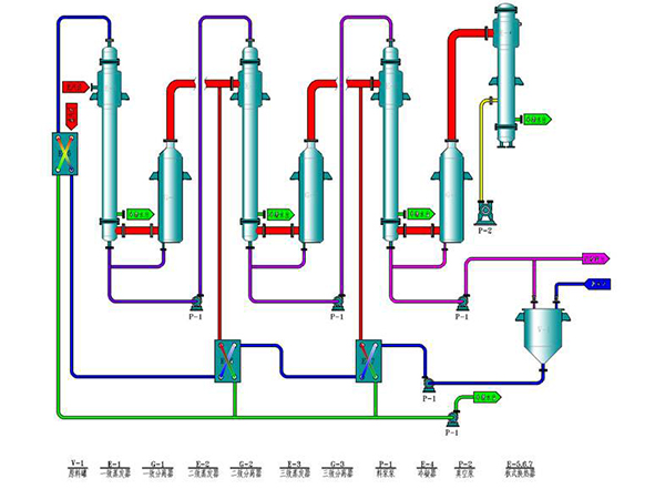 三效蒸發器主要由相互串聯的蒸發器、冷凝器、鹽分離器以及復制設備等組成三組蒸發器,以串聯的形式組成一整套的三效蒸發系統。